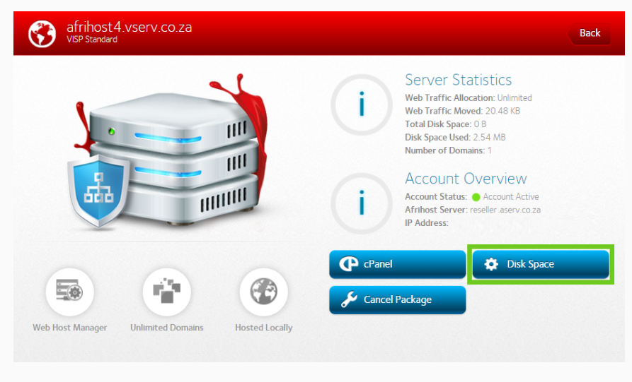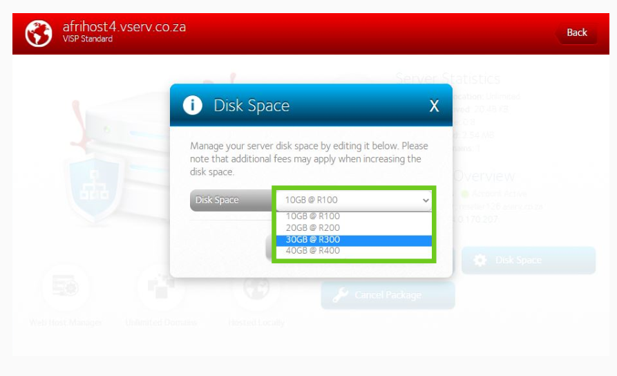 Your reseller server account has 50 GB storage space by default, if you require additional space, you can increase the storage space via ClientZone.