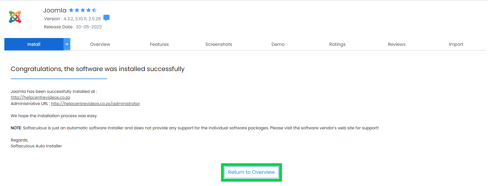 - Once the installation is completed successfully, Click the ‘Return to Overview’ button.