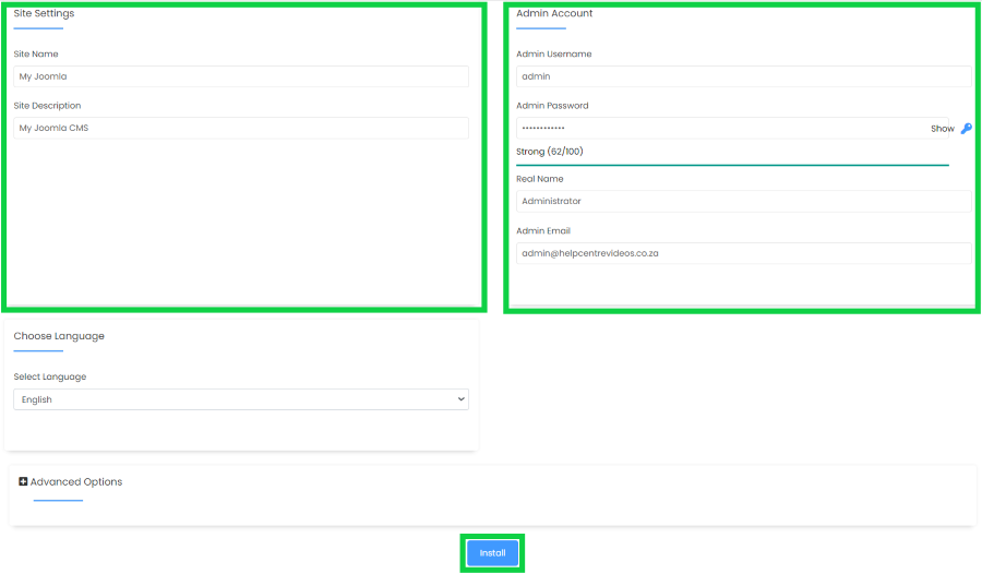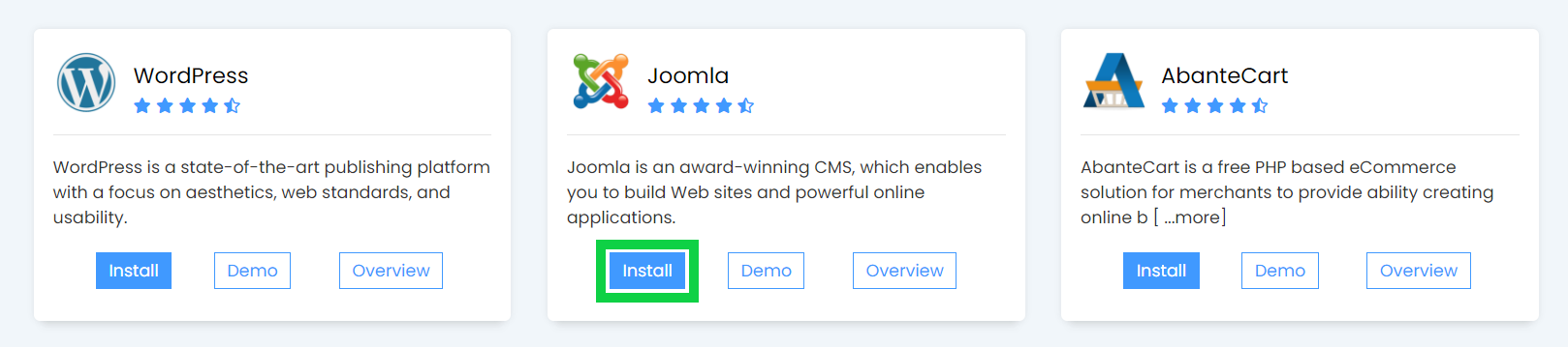 - Select ‘Install’ under Joomla.