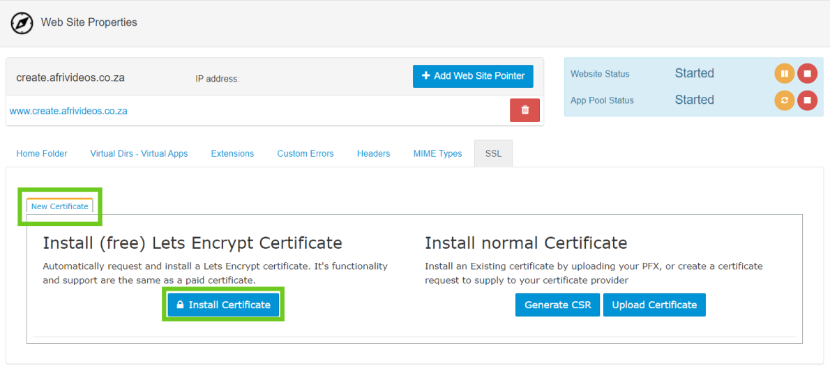 - Under New Certificate - Install (free) Lets Encrypt Certificate, select the ‘Install Certificate’ button.