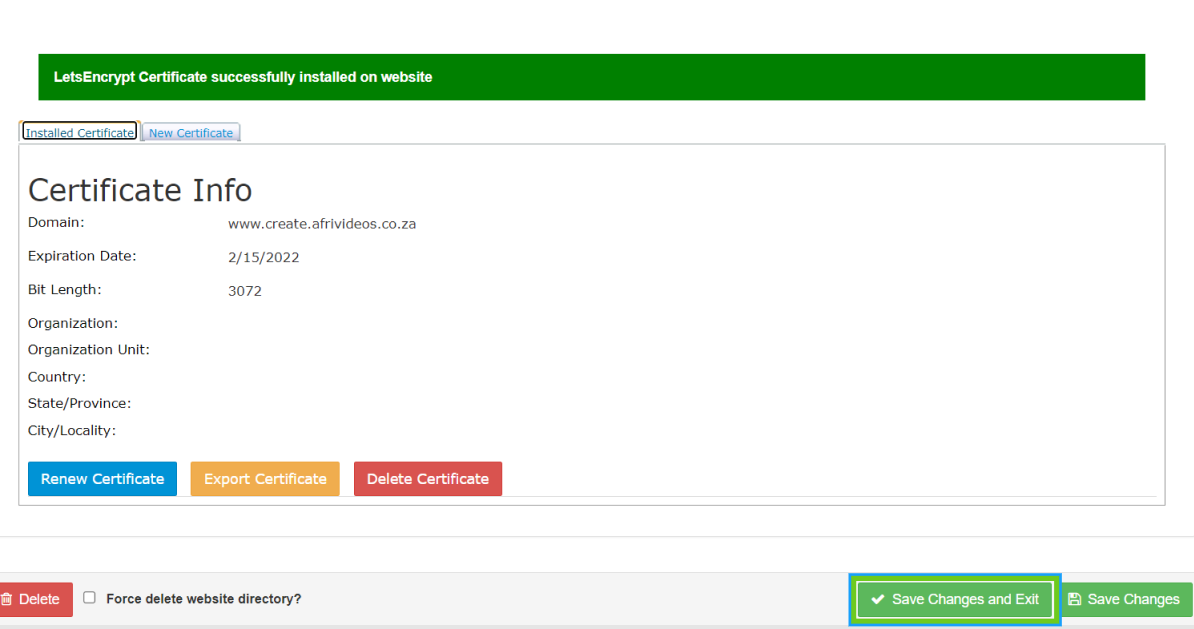 - Once the certificate has been successfully installed and you can view the certificate information, click on ‘Save changes and Exit’.