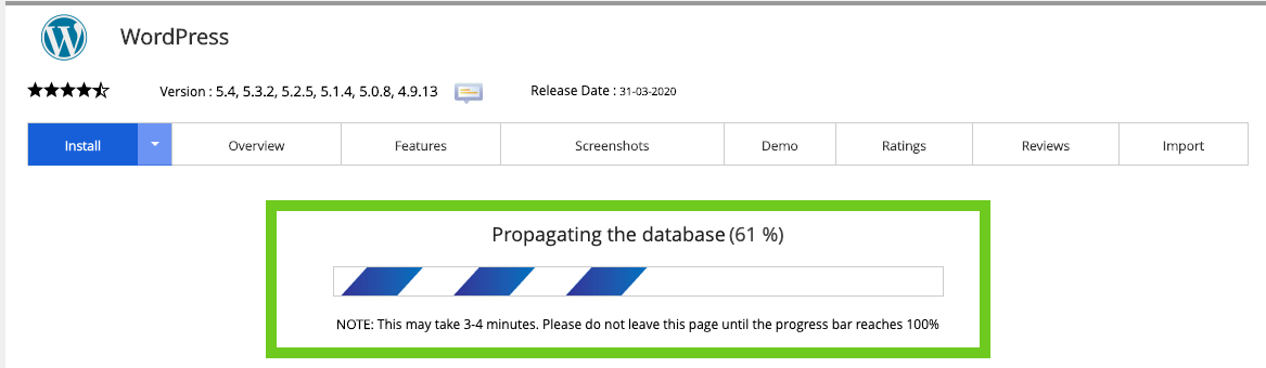 - Softaculous will check and propagate the information provided and install the files to your server for WordPress.