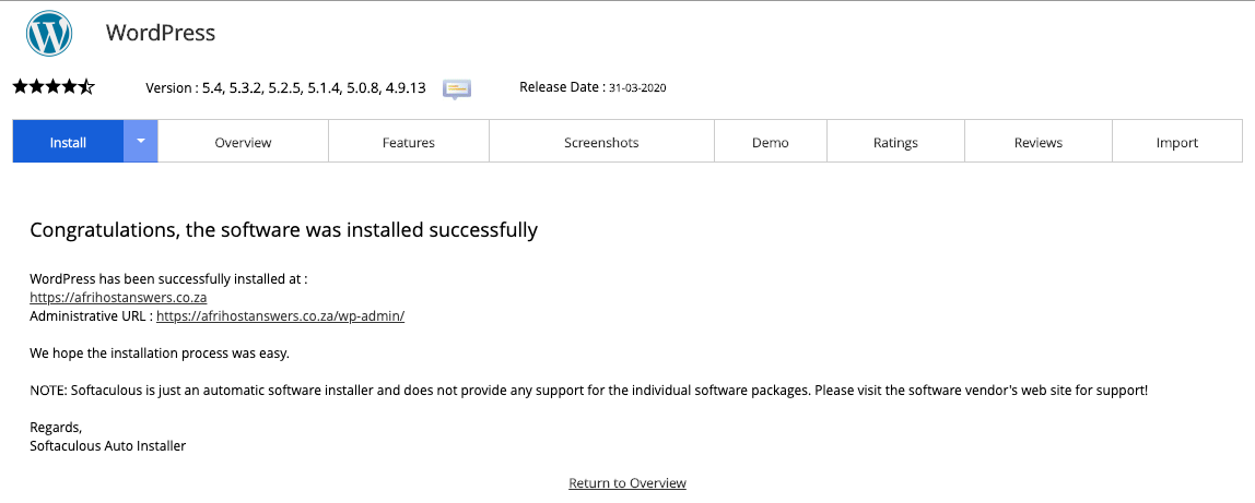 You may then select ‘Return to Overview’, where you will find the details of your installation. It is important to take note of these important details in order to access your site in the future for editing.