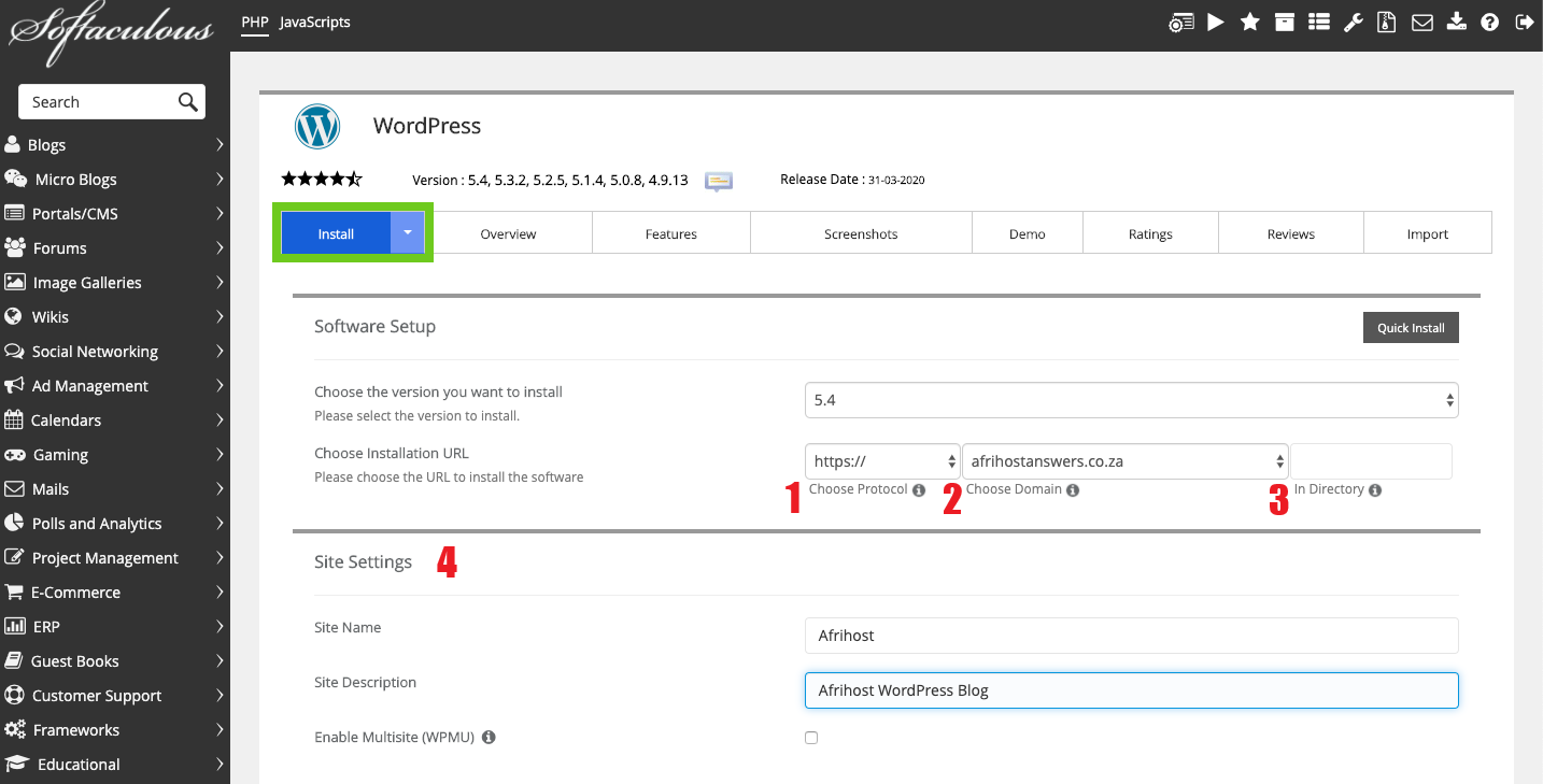 - Site Settings - If you are installing a subfolder to your site, eg: a blog, fill in the details of this page under Site Name. The page will load like this: yourdomain.co.za/blogname