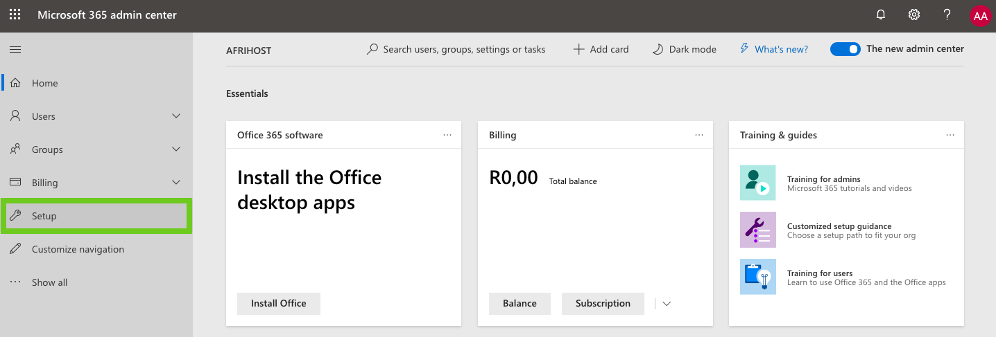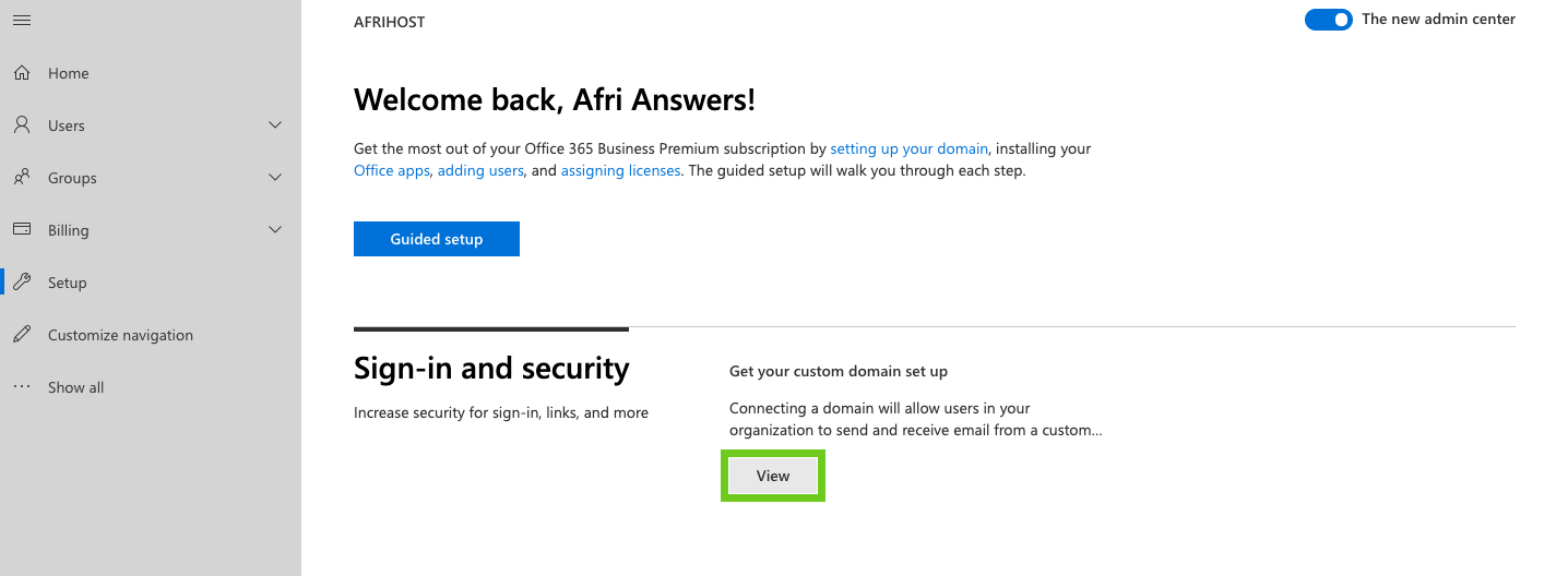 - Next to Sign-In and Security, under Get your custom domain setup select ‘View’.