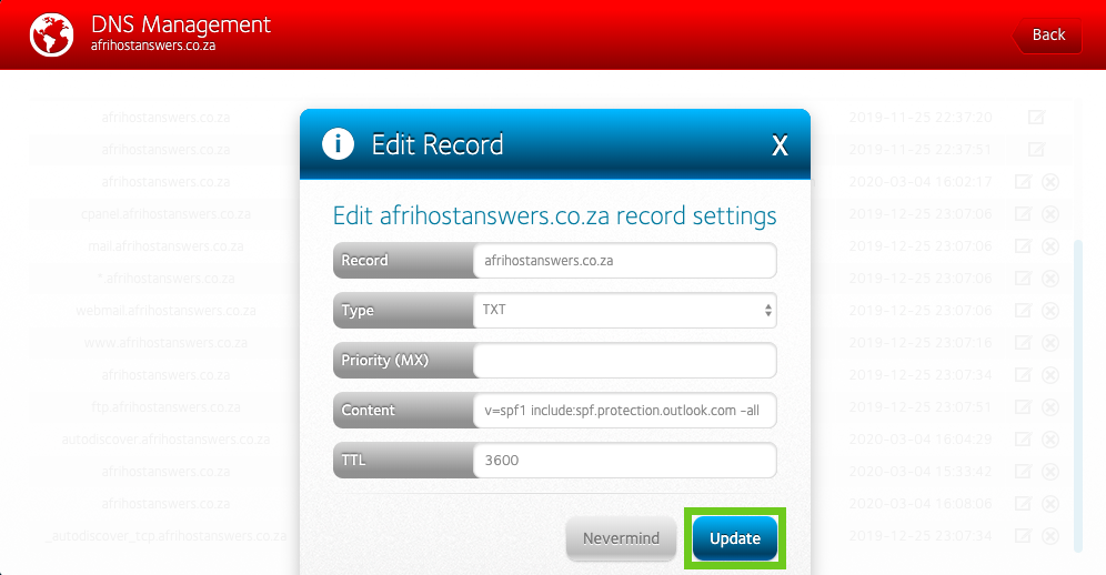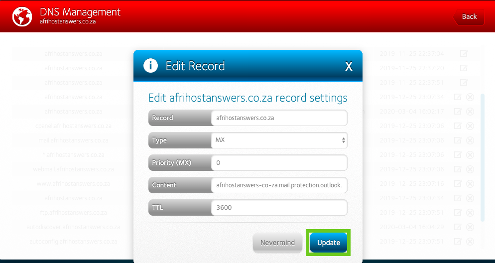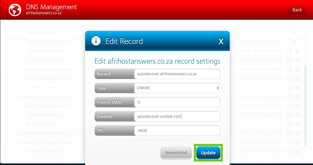 - Edit the dummy records to the actual Microsoft given TX and MX records and update the CNAME record.