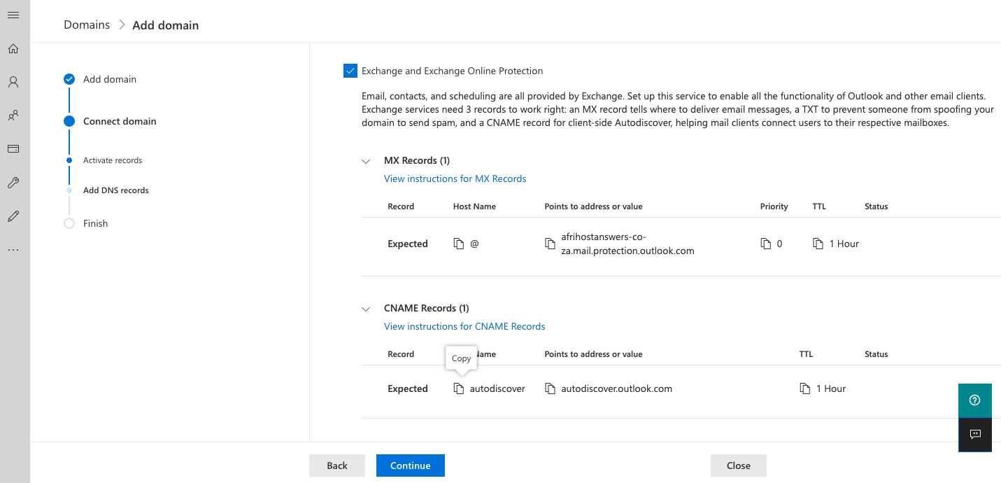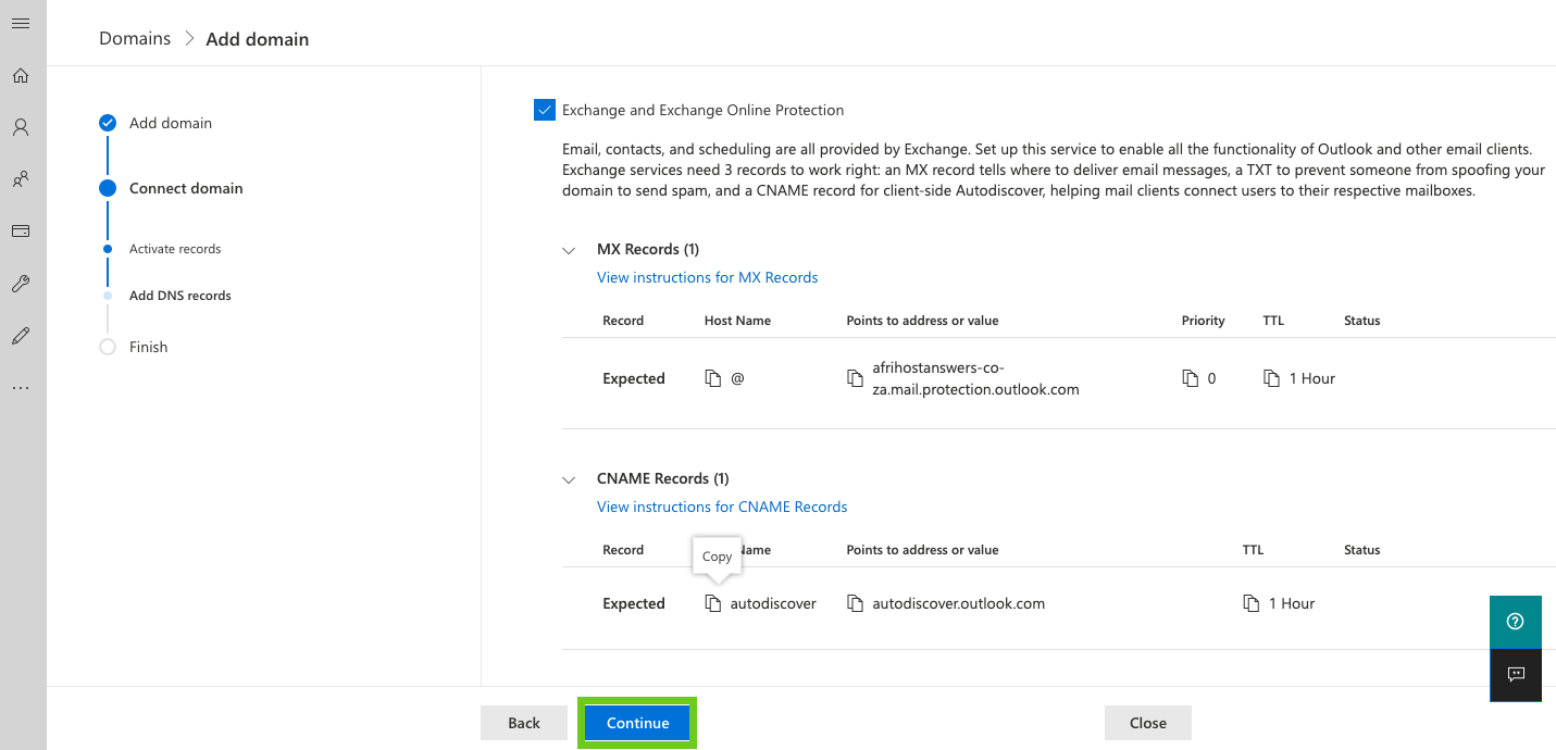 Once all records have been published in ClientZone DNS editor, select ‘Continue’ in the 365 admin centre to complete the setup.