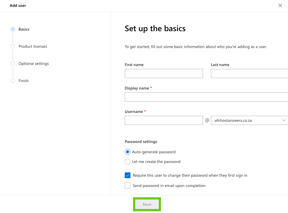 - On the Set up the basics page, enter the user’s mailbox information, including the domain email address.