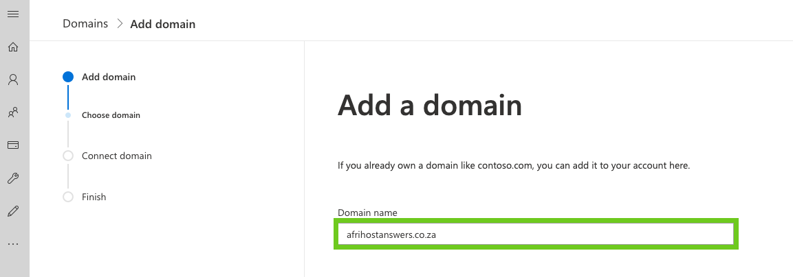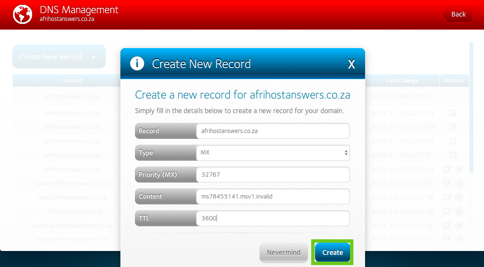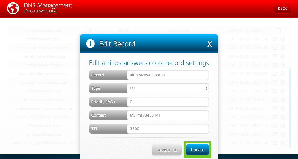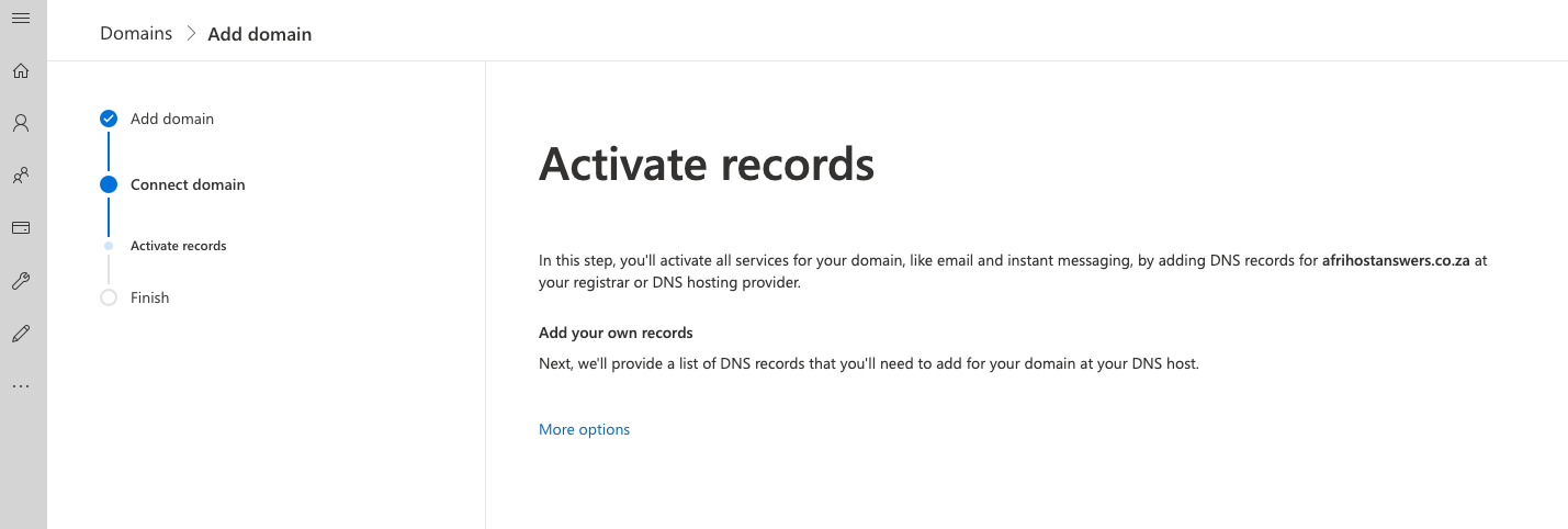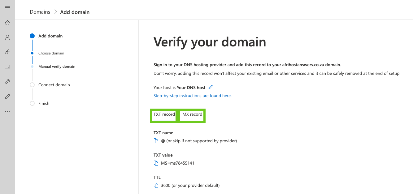 In order to verify ownership of your domain; Microsoft requires you to link dummy name server information provided by Microsoft to your domain. This can be done via the Afrihost ClientZone DNS editor.