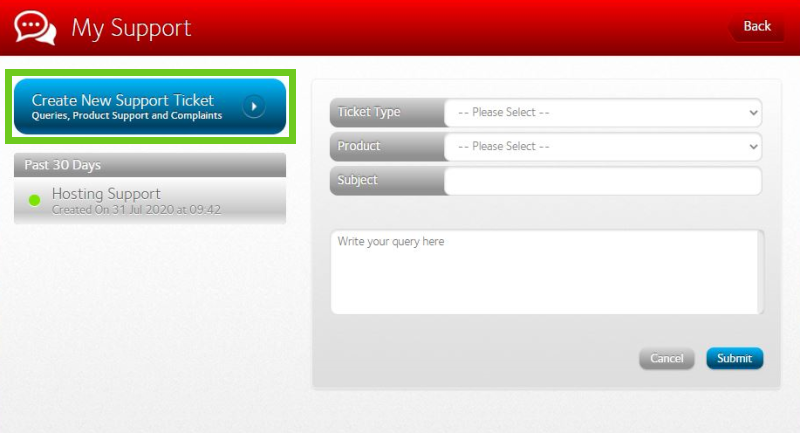 - At the top left, click on the ‘Create New Support Ticket’ button.