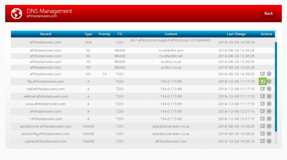 - To make changes to these settings, scroll to the DNS setting you want to change and select the ‘pencil’ edit checkbox, under the Actions section on the right-hand side.
