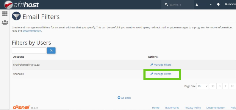 - A list of your email accounts will appear, select ‘Manage Filters’ of the desired email account you wish to access.