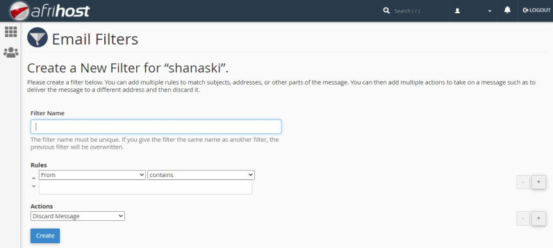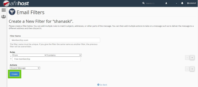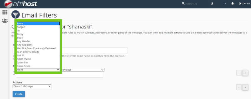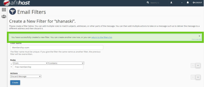 - Once you have set up the rules as desired for the Filter select ‘Create’.