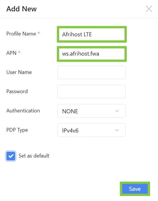 If you’re using Afrihost with another LTE network, make sure your device is set up with the correct APN settings: