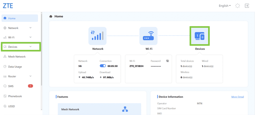 The ZTE G5TS is a high-performance router designed for fast and reliable connectivity. It comes with a built-in 5G chipset, four Gigabit Ethernet ports for multiple wired connections, dual-band Wi-Fi 6 for improved speed and coverage and support for up to 64 wireless devices.