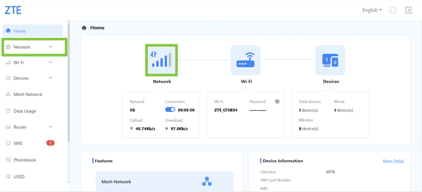 - Or if you choose the ‘Network’ option from the left-hand menu, make sure to select ‘Mobile Network’ from the drop-down list for LTE.