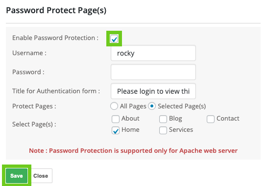 - Username - Enter a username. This will be asked when logging in to the password-protected pages/site.