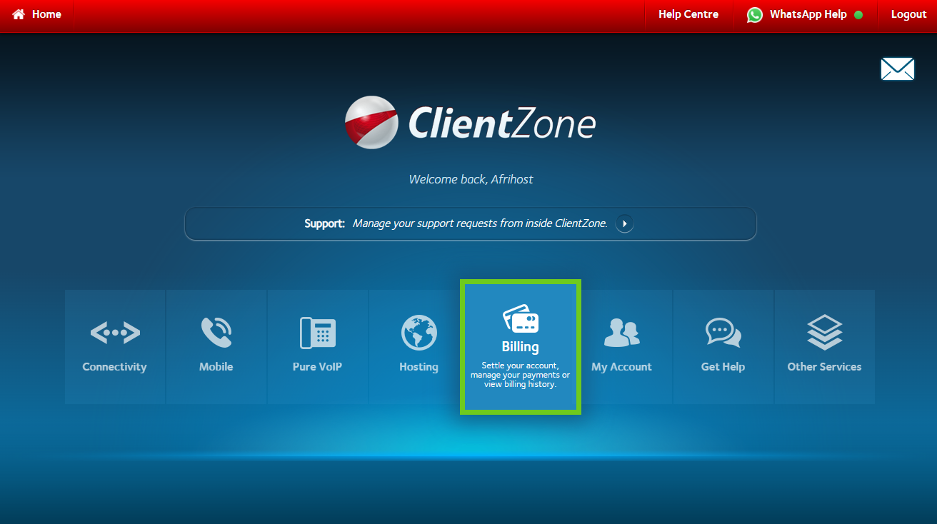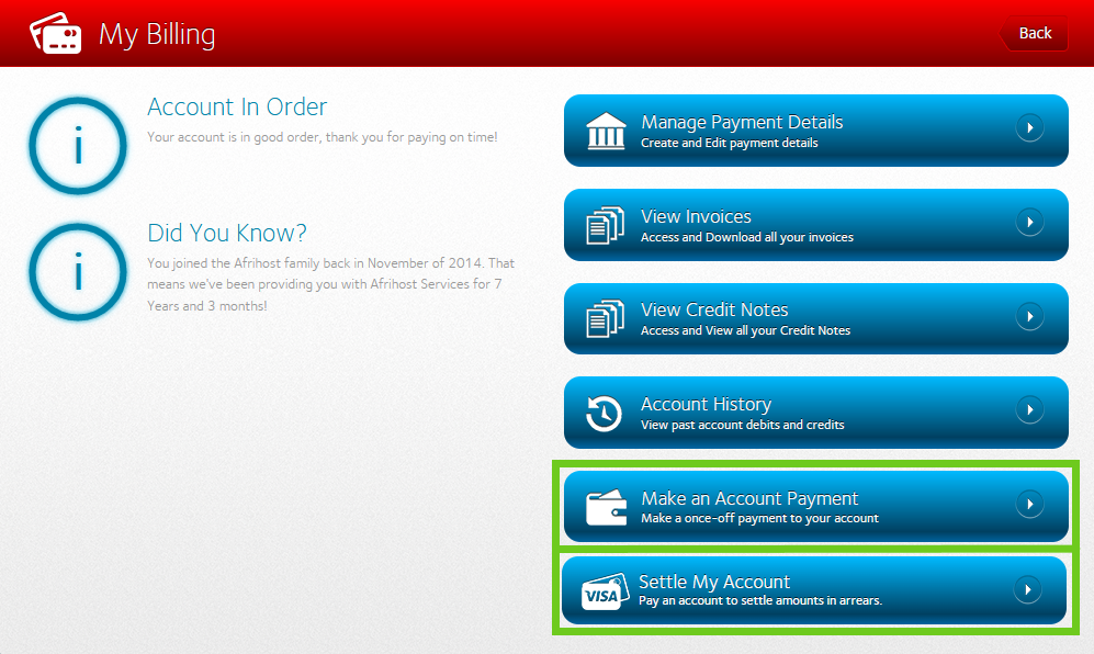 - Once in the Billing section, click on the 'Settle My Account' Button to settle amounts in arrears or select the ‘Make an Account Payment' button to make a once-off payment to your account.