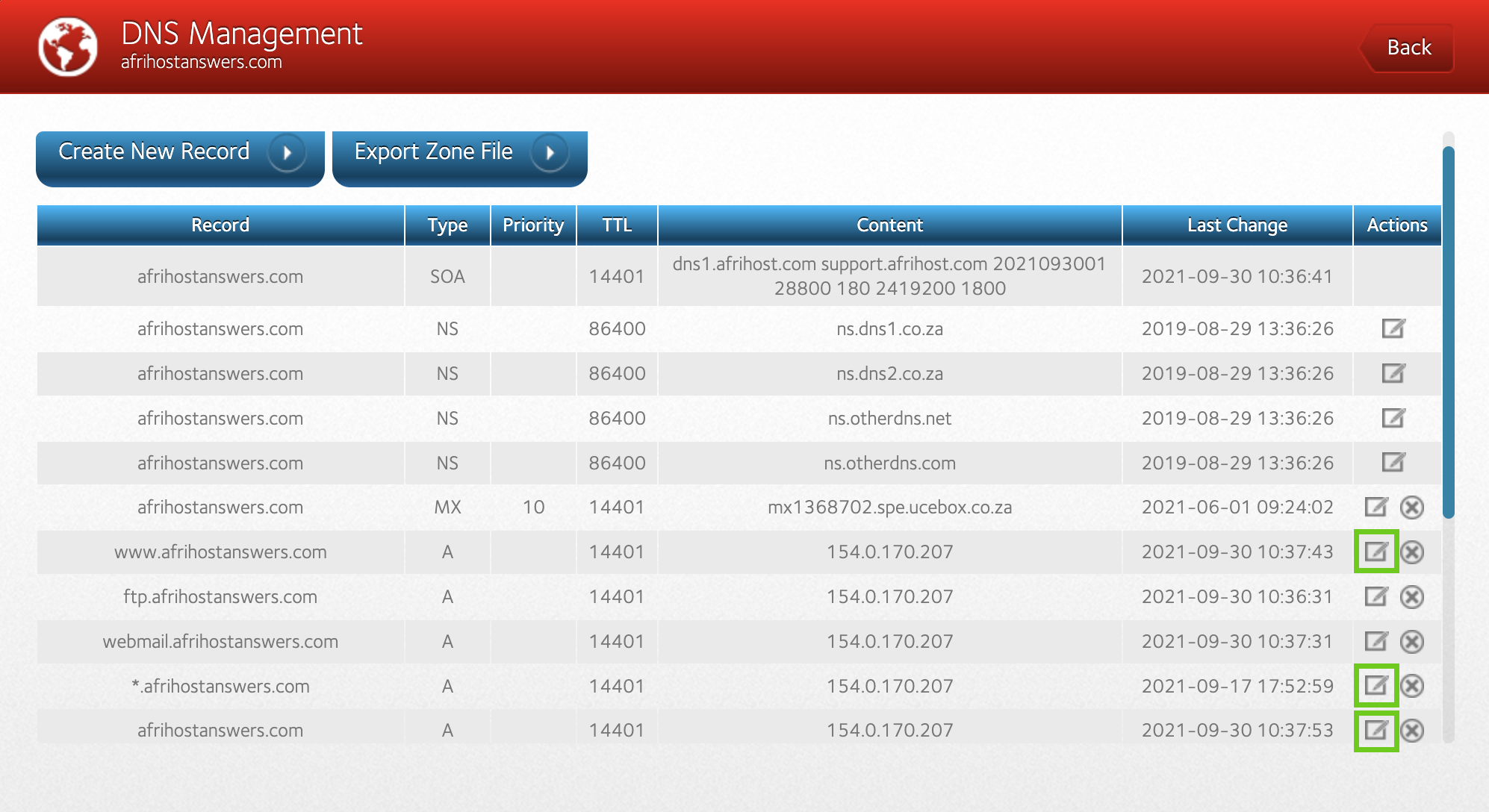 - Browse through the records and edit the desired ‘A’ Records as indicated or supplied by your external host.