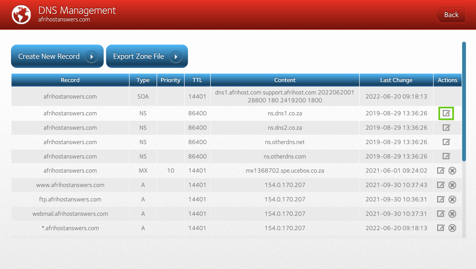 - Select the edit icon next to the ‘www.yourdomainname.co.za’ A record.