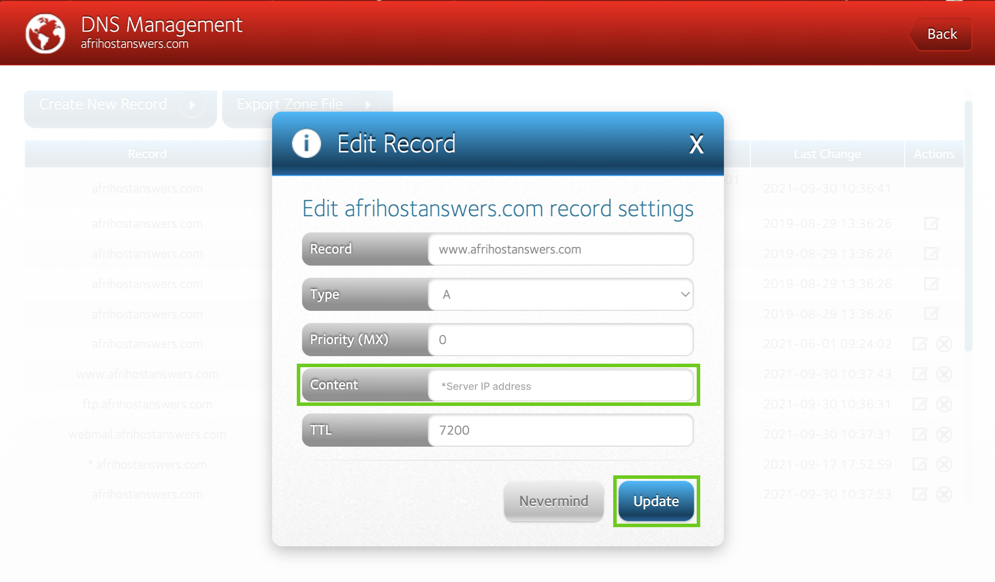 - You will need to know the type of record, Content IP, and TTL (optional).