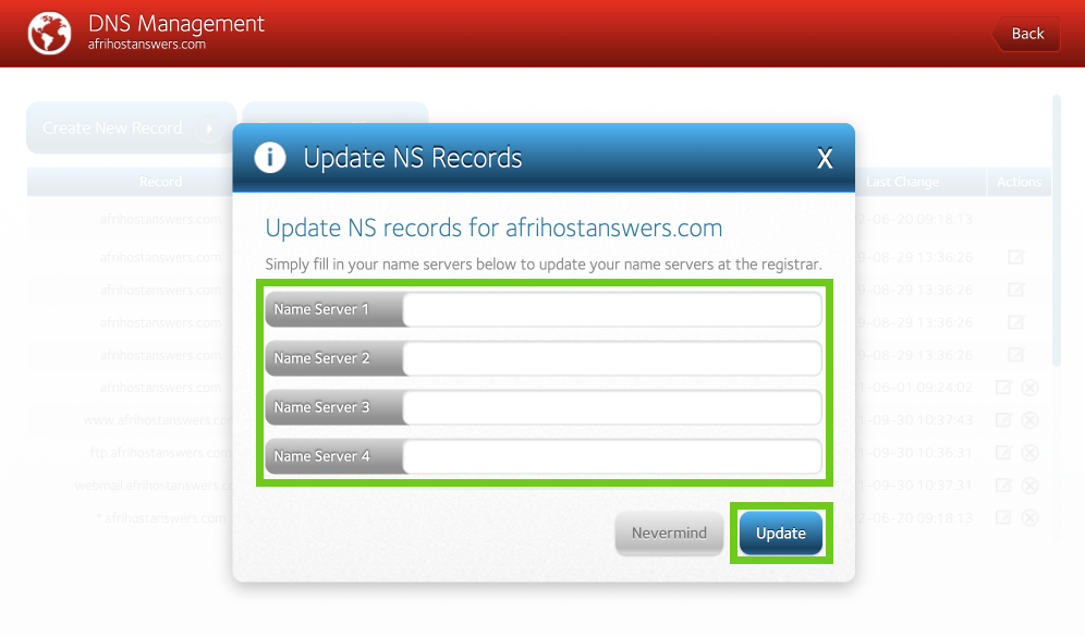- Browse through the records and edit the ‘NS’ Records as indicated or supplied by your external host.