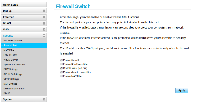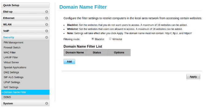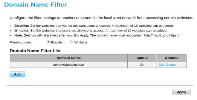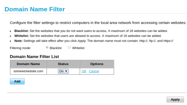 - Select the ‘Enable domain name filter’ tick box and click ‘Apply’.