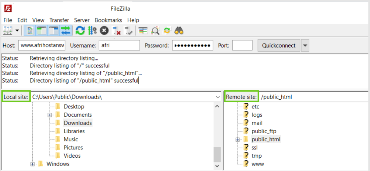 - FileZilla will attempt to connect, and the status will display ‘Directory Listing Successful’ once connected.