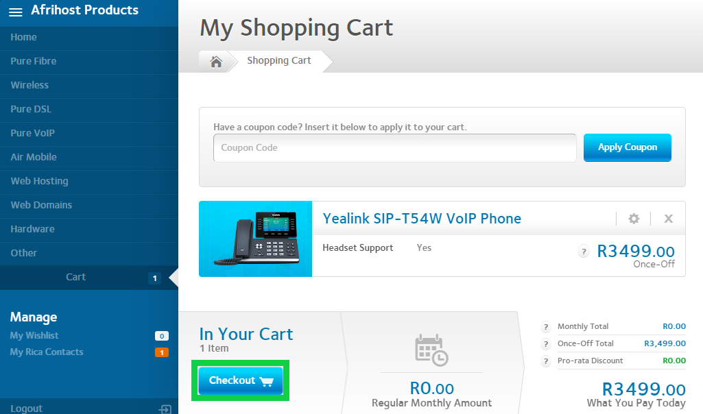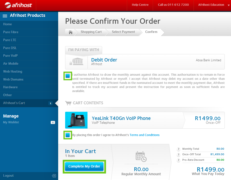 - To complete your order, check the box to accept the debit order agreement and agree to Afrihost Terms & Conditions.