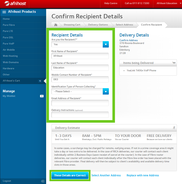 You have the option to collect your device from the Afrihost HQ walk-in centre or request delivery.