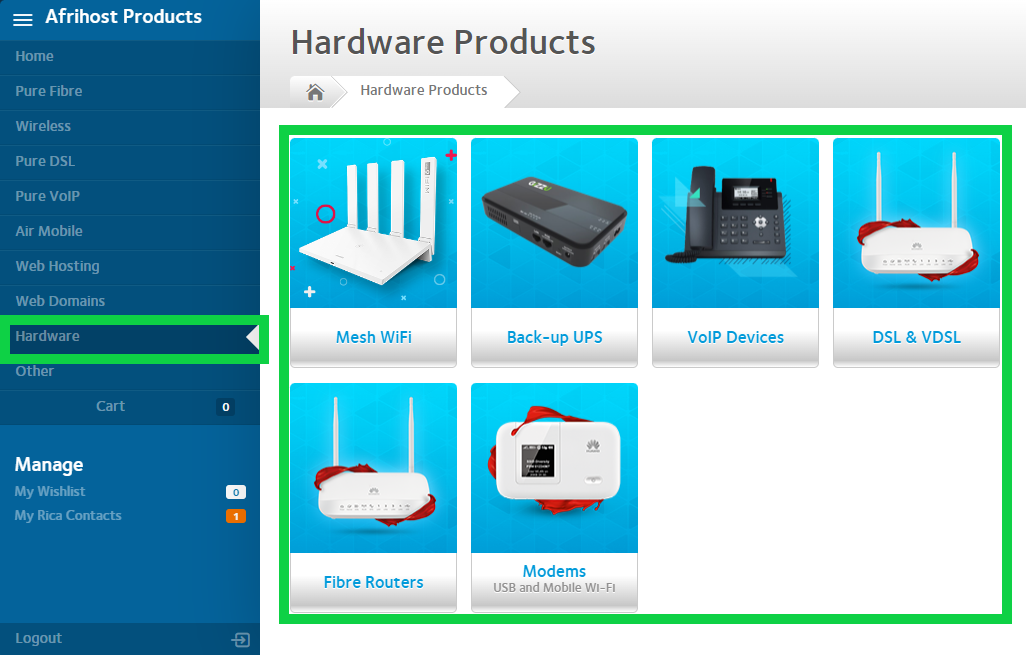 Routers can be ordered via the Afrihost Order form which can be accessed via the Afrihost website or Mobile App.