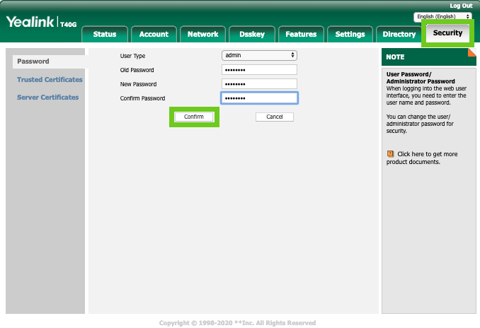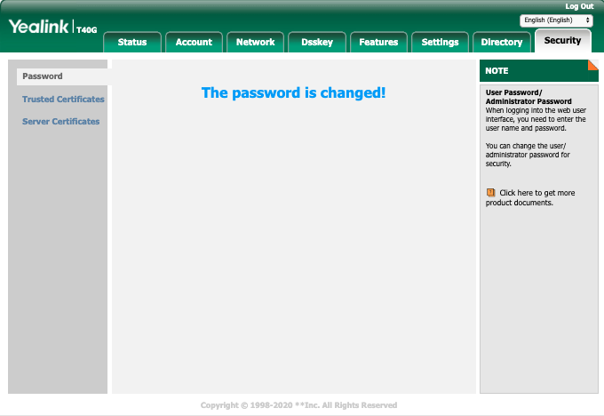 The default password to log into the Yealink Phone is ‘admin’ which is not secure, it is recommended to change the password to something more secure.