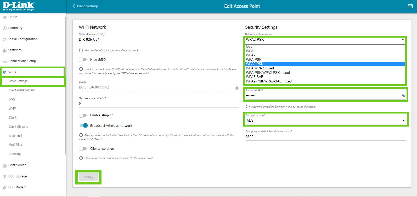 When setting up your new access details ensure the WiFi encryption is turned on. There are many options available on the routers such as WPA2-PSK (TKIP), WPA2-PSK (AES), and WPA2-PSK (TKIP/AES).