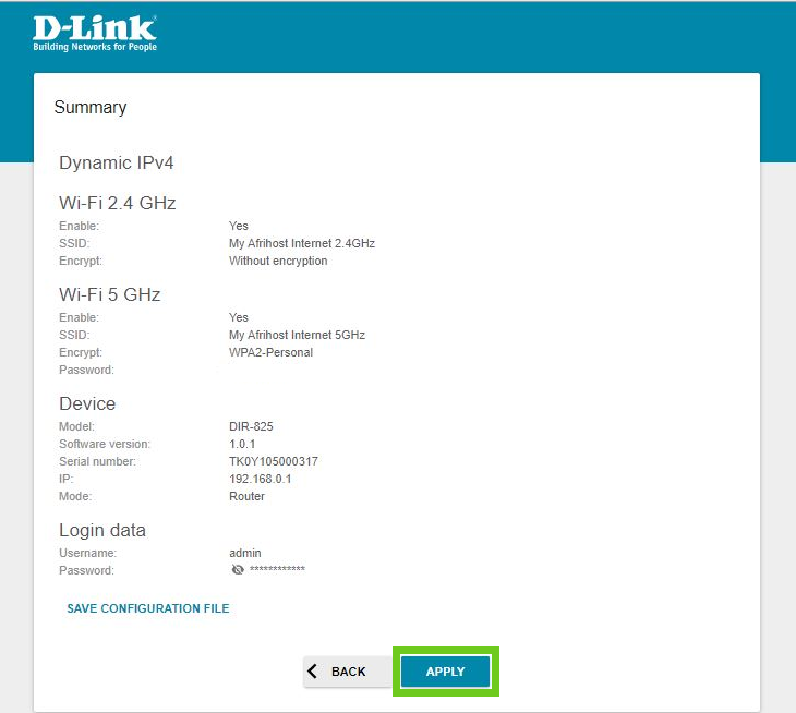 - Please note the summary of your settings or select ‘Save Configuration File’ to download the configuration backup file.