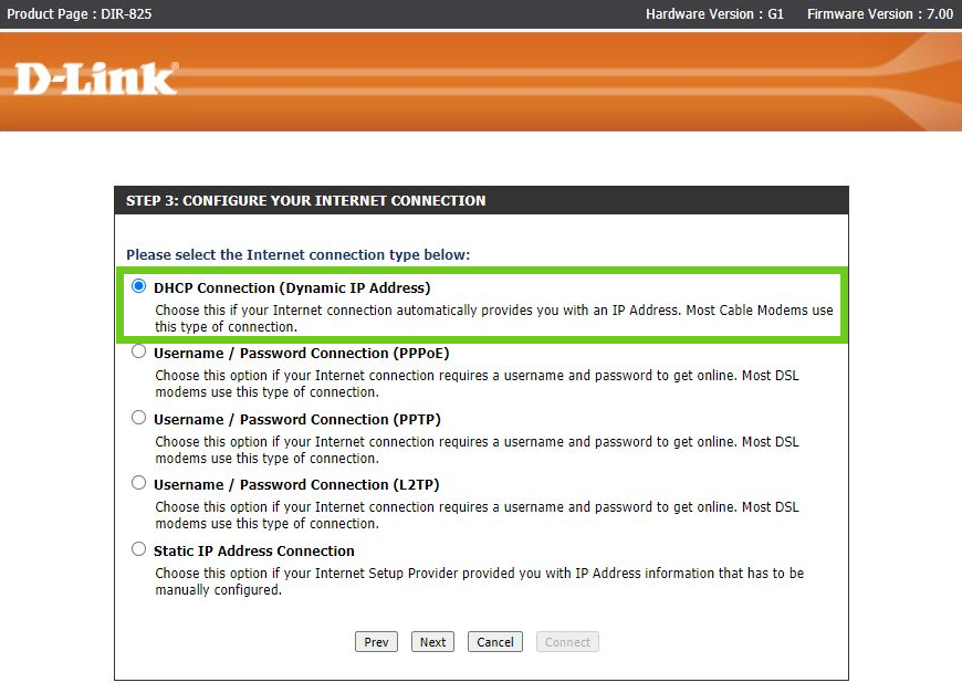 - Step 3 will require you to select the correct configuration for your internet connection. Select DHCP Connection and click ‘Next’.