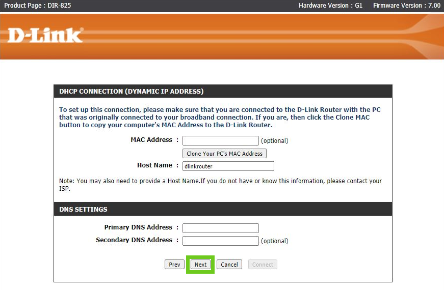 How to set up a D-Link 825 Fibre Router for a DHCP connection