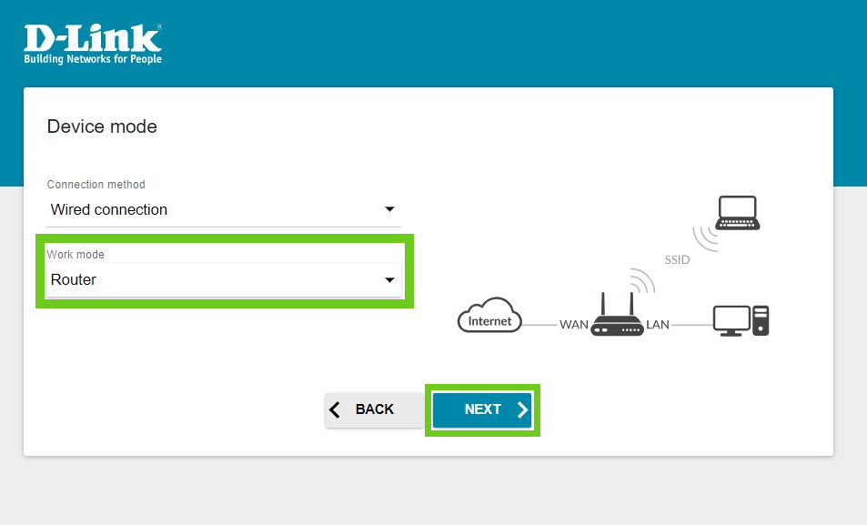 - Under Work Mode, from the drop-down menu select ‘Router’.