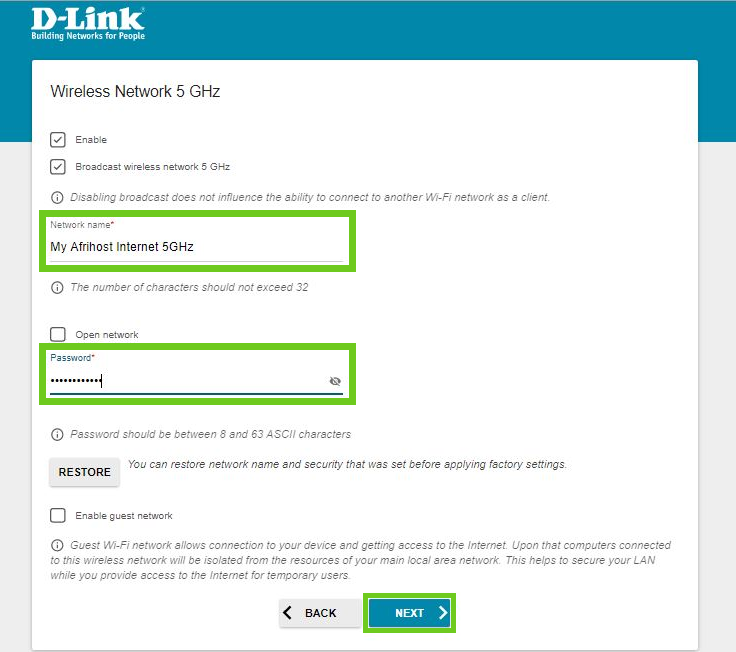 - Then you will need to configure the 5Ghz wireless network. Enter the Network Name and a secure password of your choice and click ‘Next’.