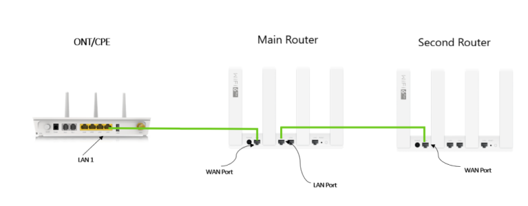 - Connect an ethernet cable from a LAN port on the main router to the WAN port of the secondary router.