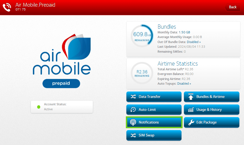 - Select the Air Mobile package you wish to set up notifications for, on the right-hand side.