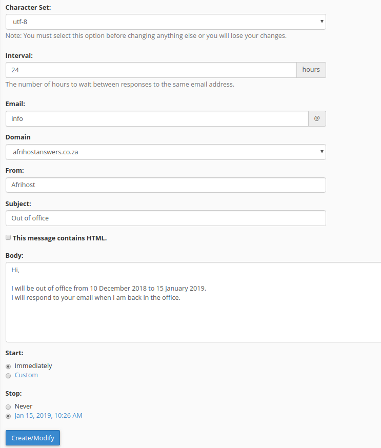 - Then click the 'Create/Modify' button to set up the autoresponder.