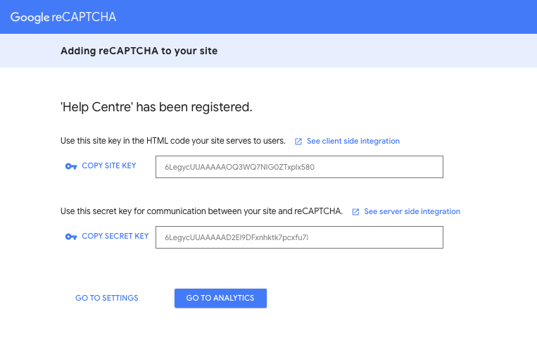 - Once the site has been registered you will be shown the Site Key and Secret Key.