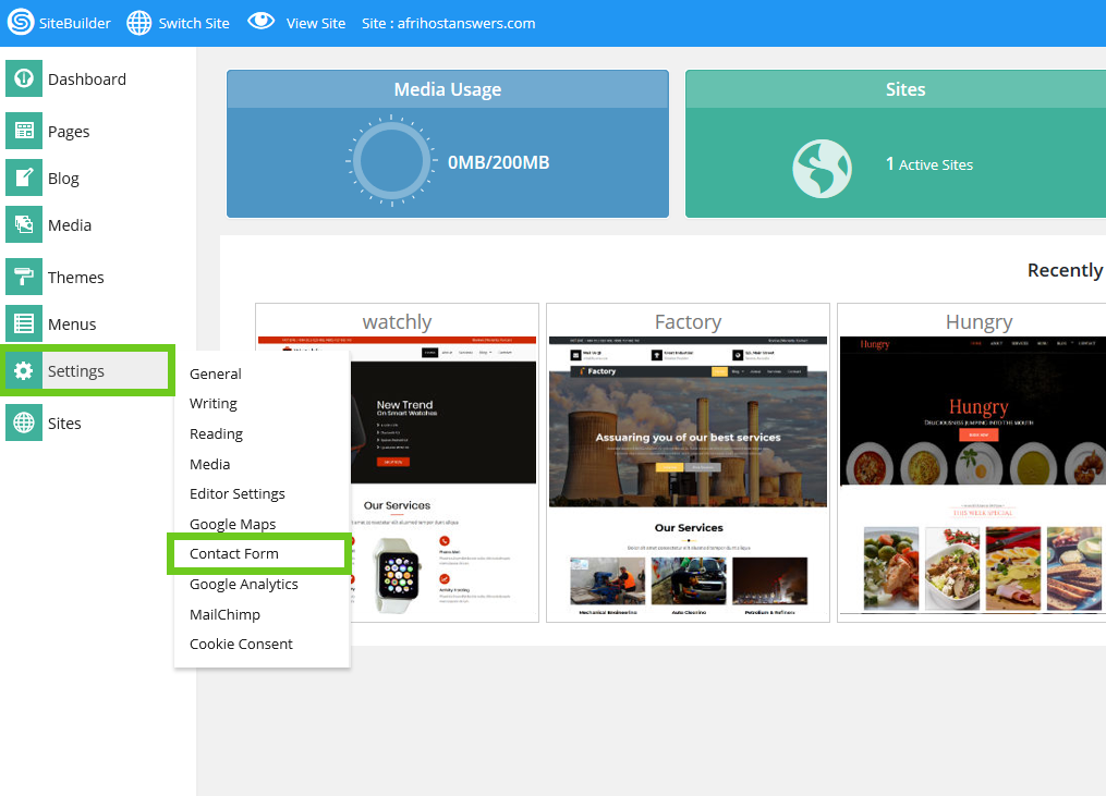 - From the main menu on the left-hand side, click ‘Settings’ and select ‘Contact Form’.