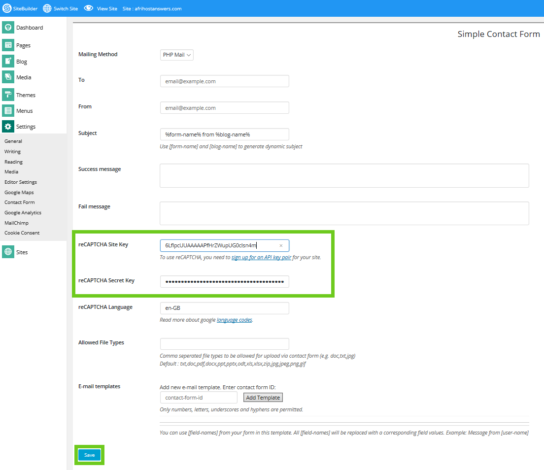 - On the Contact Form Setting Page, Enter the reCAPTCHA Site Key and reCAPTCHA Secret Key in the relevant boxes.