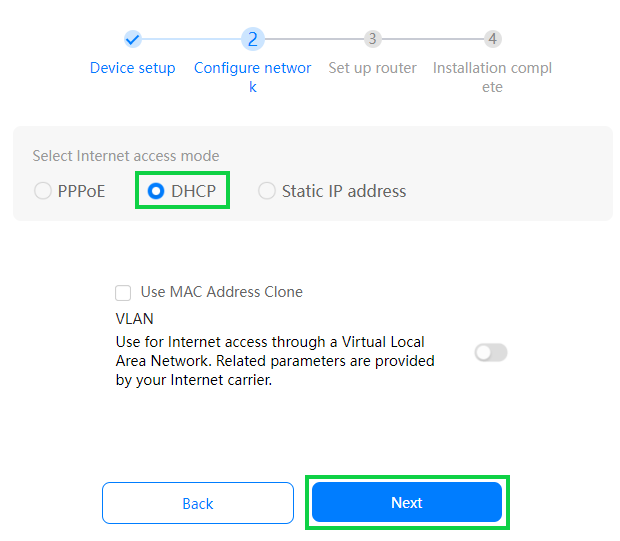- Select ‘DHCP’ as the internet access mode.