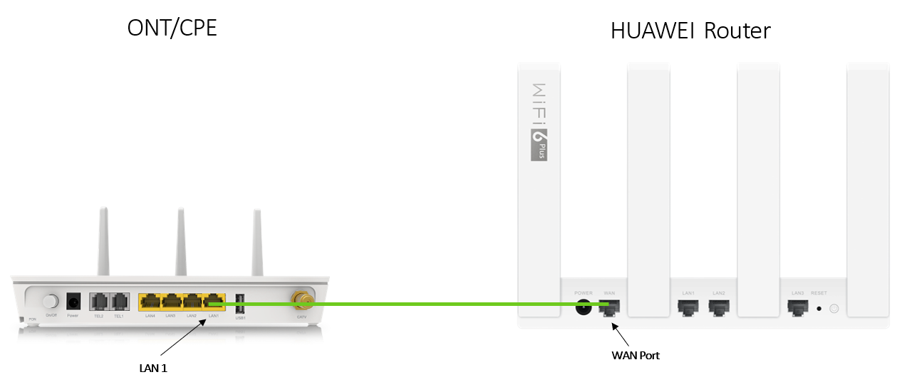 - Connect your Huawei router to the CPE/ONT using an ethernet cable.