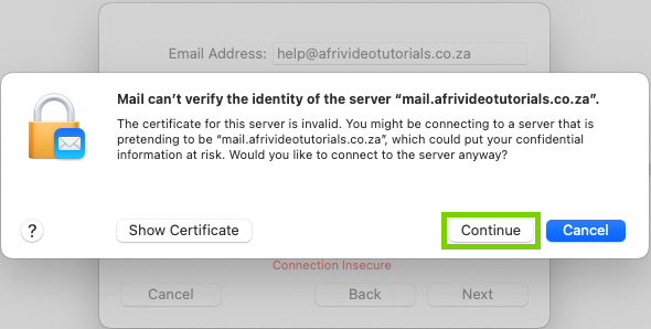 - You may get a certificate error notification saying: ‘Mail can’t verify the identity of your server and your domain name’, simply click ‘Continue’.