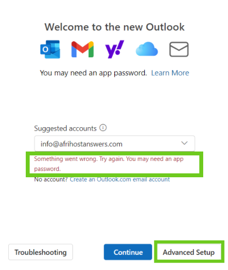- Select ‘Advanced setup’ to manually setup your email account.