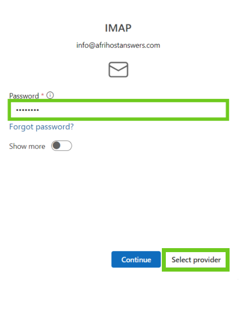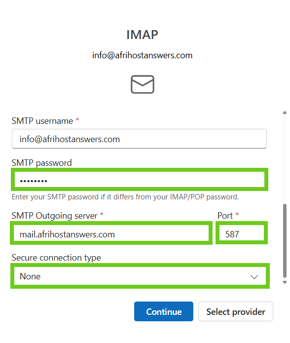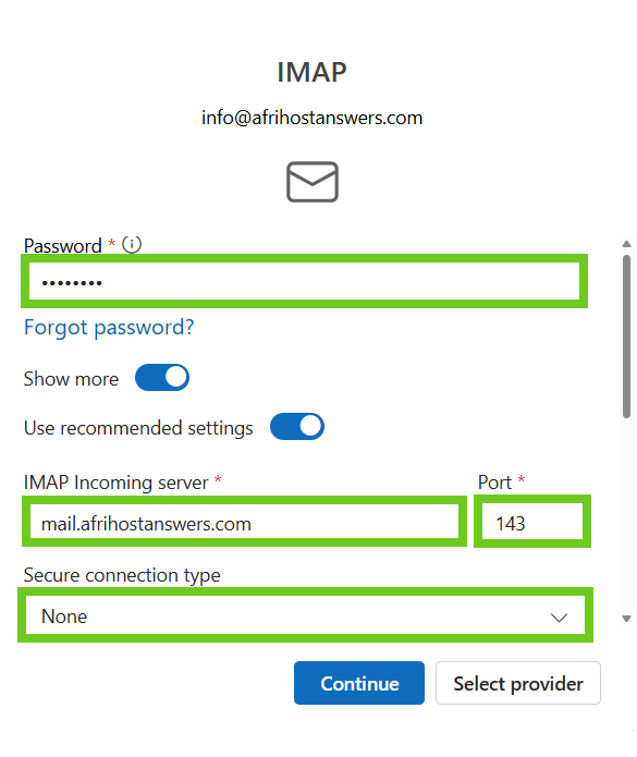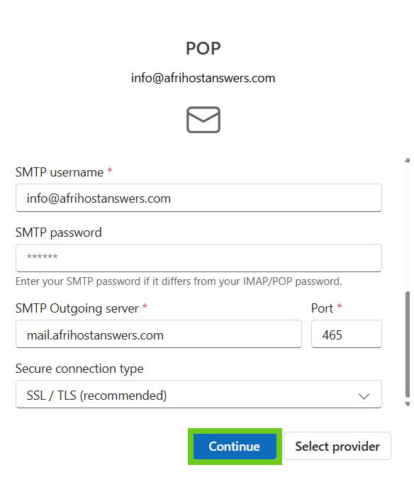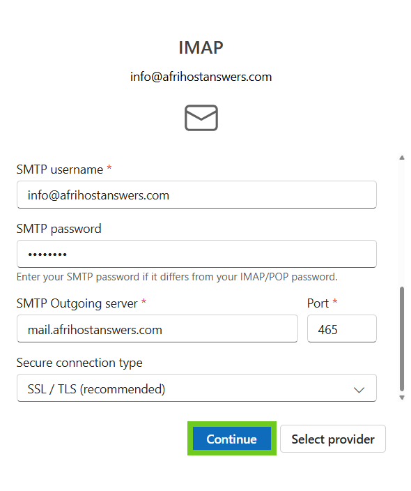- Select ‘Continue’ once done entering the email settings.