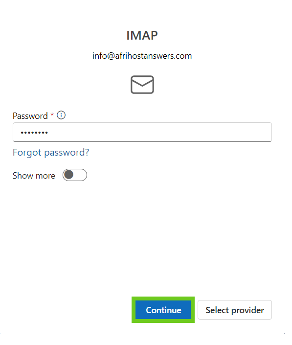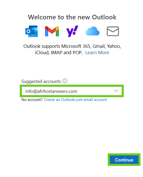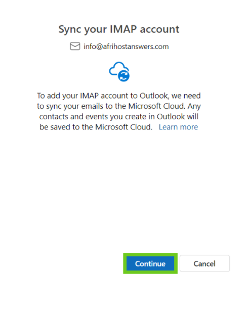 - Select ‘Continue’ to add the email account.